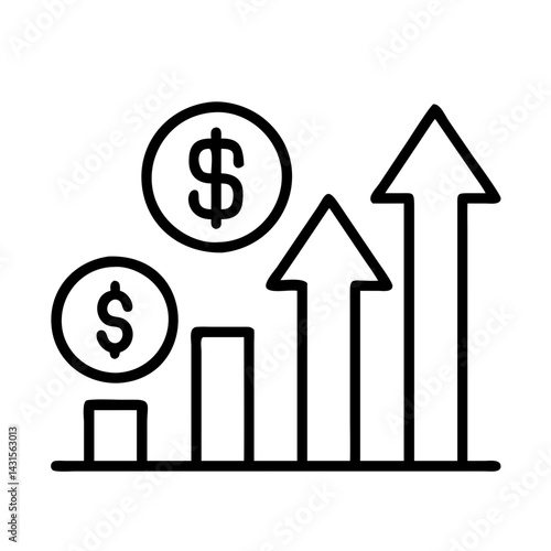 Financial growth chart with dollar coins and upward arrows showing business success rate trend
