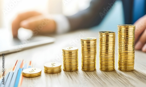 Financial Growth. Stacks of gold coins ascend, reflecting success. Person working on laptop and charts visible