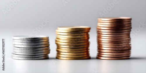 Financial Growth Visualization with Metallic Coin Stacks in Progressive Height for Business and Investment Analysis