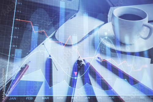 Financial market graph hologram and personal computer on background. Double exposure. Concept of forex.