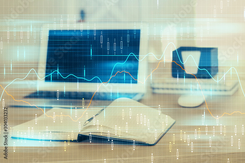 Financial market graph hologram and personal computer on background. Multi exposure. Concept of forex.