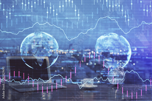 Financial market graph hologram and personal computer on background. Multi exposure. Concept of forex.