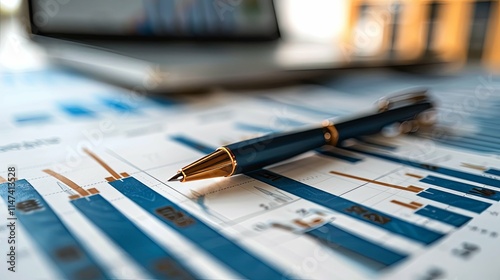 Financial Report Analysis: Pen Resting on Detailed Bar Charts and Graphs