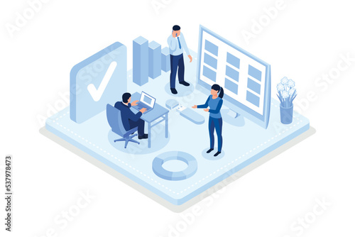 Financial report, Characters analyzing balance sheet, isometric vector modern illustration
