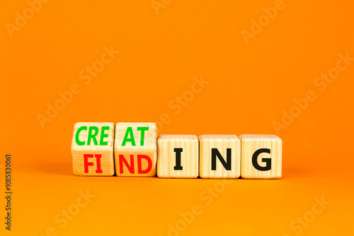 Finding or creating symbol. Turned wooden cubes and changed words Finding to Creating. Beautiful orange table orange background copy space. Business creating or finding concept.