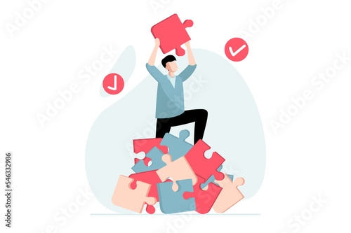 Finding solution concept with people scene in flat design. Man is looking for right solutions and new ideas, collects puzzles and solves jigsaw. Illustration with character situation for web