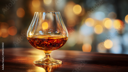 Fine Cognac in a Glass on Polished Mahogany Table with Bokeh Background of Warm Lights