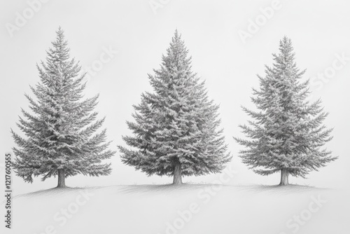 Fine pencil drawing of three evergreen trees on a blank background showcasing intricate details and shading techniques
