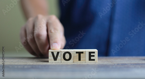 finger on wooden cube block with VOTE word written on wood block, business concept.