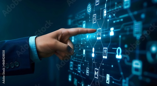 Finger pointing towards glowing digital icons representing various marketing platform Digital Marketing Concept