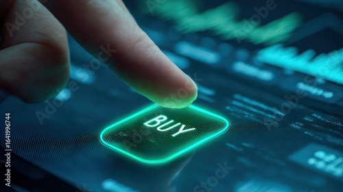 Finger pressing a buy button on a digital interface, concept for online shopping and e-commerce.