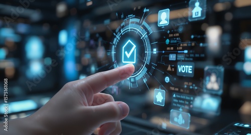 Finger Tapping Bright Blue Hologram Interface with Checkmark for Concept of Online Vote