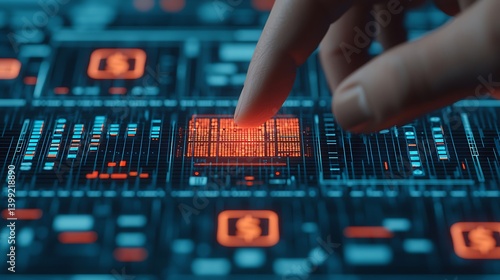 Finger touches glowing circuit board, futuristic technology interface, data processing, digital design, and innovation concept.