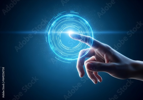 Finger touching a glowing blue digital circular interface on a dark background hand