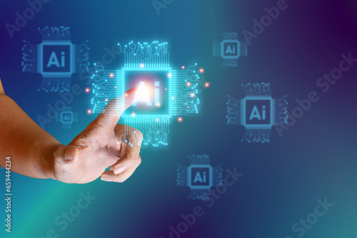 Finger touching on artificial intelligence or AI interface diagram and on blue background. Connection of technology and innovation, machine learning. Technology and science concept.