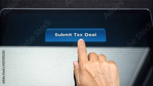 Finger touching “Submit Tax Deal” button on digital screen, representing tax deal compliance, electronic filing process, and secure online tax submission in modern financial systems