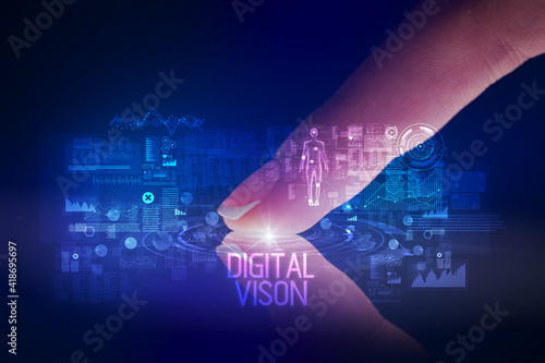Finger touching tablet with web technology icons and DIGITAL VISON inscription