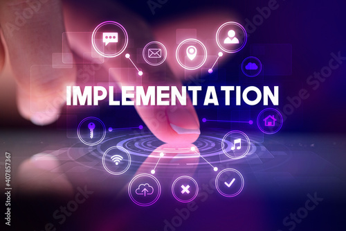 Finger touching tablet with web technology icons and IMPLEMENTATION inscription, web technology concept