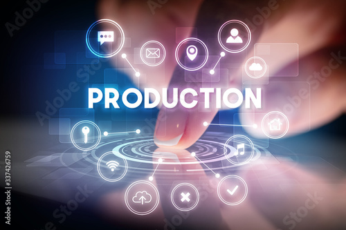 Finger touching tablet with web technology icons and PRODUCTION inscription, web technology concept