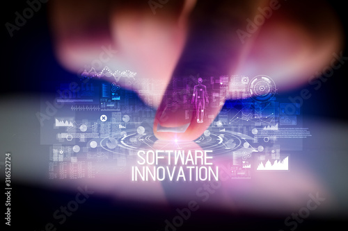 Finger touching tablet with web technology icons and SOFTWARE INNOVATION inscription