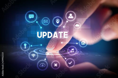 Finger touching tablet with web technology icons and UPDATE inscription, web technology concept