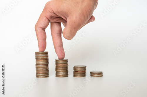 Fingers walking on pile of coins isolated on white background. in concept of business, financial, money, or investment.