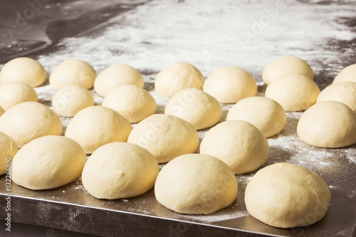 Finished dough in the bakery, in the steel table. Working process.