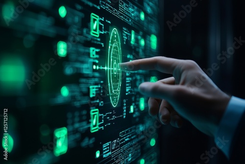 Fintech banking automation concept. Digital interface interaction with a glowing green display.