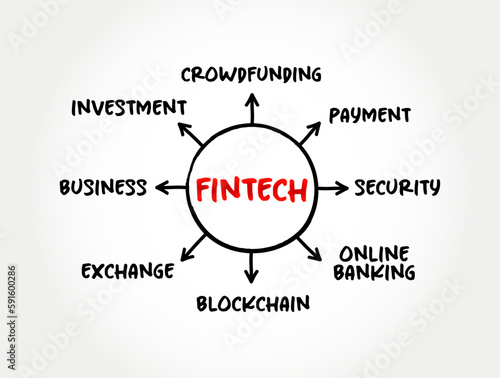 FinTech (Financial technology) - innovation that aims to compete with traditional financial methods in the delivery of financial services, mind map concept for presentations and reports