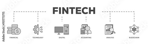 Fintech icons process structure web banner illustration of financial, technology, digital, accounting, analysis and blockchain icon png transparent background.
