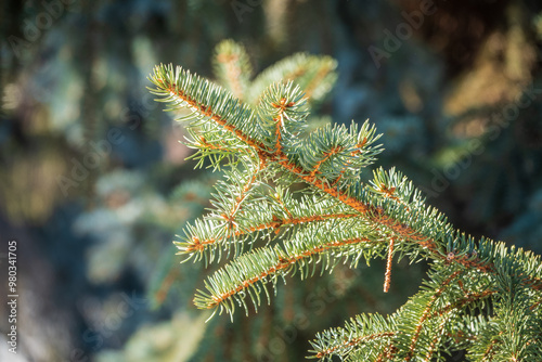 Fir branch with needles in the sunset light