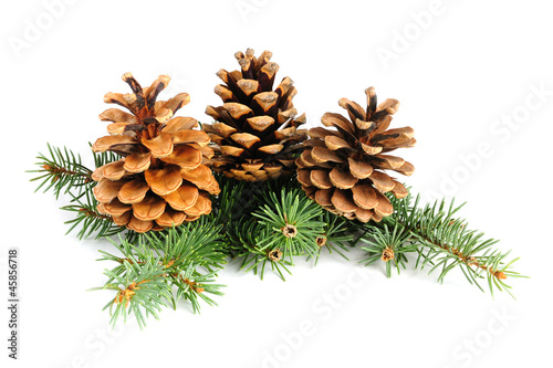 Fir branches with cones isolated on white background