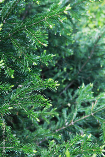 Fir branches with cones. Pinery. Trees in the forest. Glare of the sun.