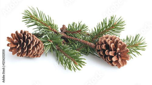 Fir tree branch christmas frame with pinecones isolated on white background.