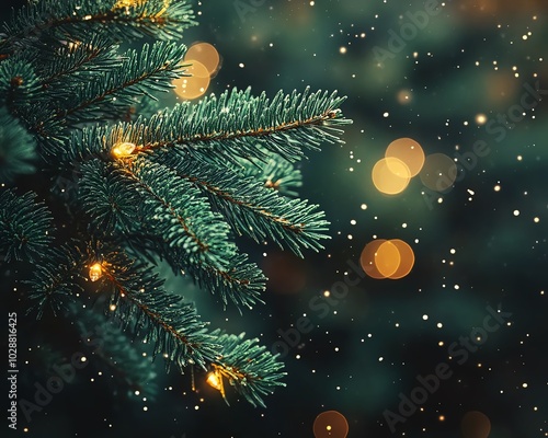 Fir tree branch closeup featuring vibrant emerald needles, contrasted with warm bokeh lights, soft focus background, festive Christmas vibe