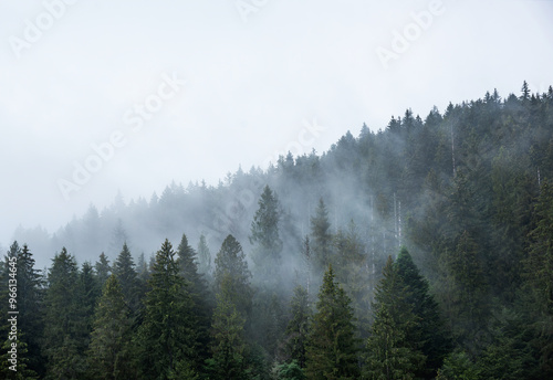 Fir trees on a mountain against the backdrop of a foggy mystical forest.