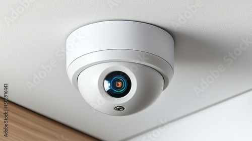 Fire alarm, alert and installation concept. Ceiling-mounted security camera in a modern interior setting.