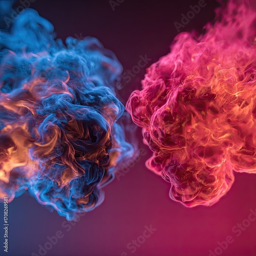 Fire clash on red and blue background, against banner. . Confrontation concept.