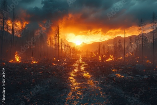 Fire engulfs forest landscape at sunset creating a dramatic view of destruction and nature's resilience in twilight