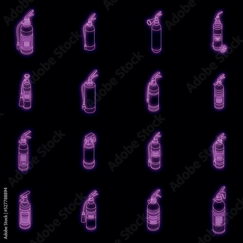Fire extinguisher icons set. Isometric set of fire extinguisher vector icons neon color on black