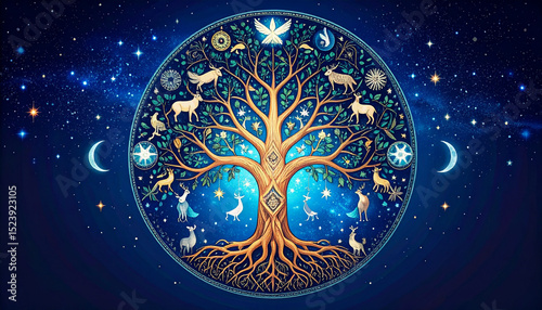 Firefly enchanted tree of life with nocturnal animals and celestial elements in symmetrical circular design glowing under starry night sky with crescent moons