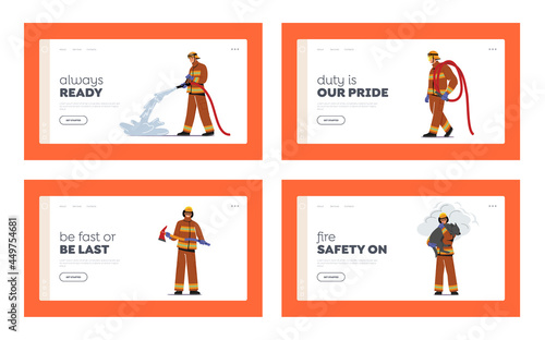 Firemen Team Fighting with Blaze Landing Page Template Set Fire Fighters Male Characters in Uniform Holding Buckets