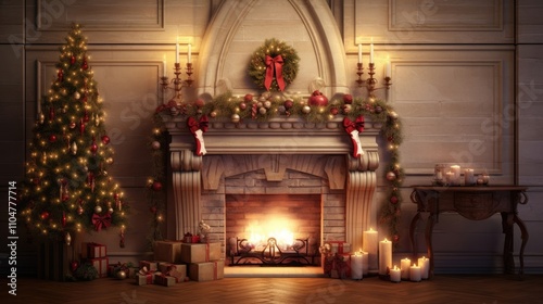 Fireplace Christmas Scene with Wreath, Presents, and a Warm Fire for Festive Gatherings