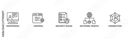 Firewall banner web icon for network security system with icon of monitoring, control, security rules, network traffic and connection