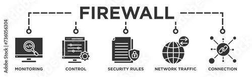 Firewall banner web icon vector illustration concept for network security system with icon of monitoring, control, security rules, network traffic and connection