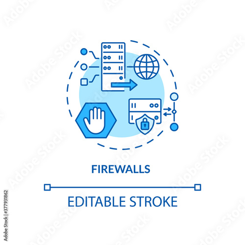 Firewalls concept icon. Unauthorized access prevention idea thin line illustration. Traffic flows control. Cybersecurity tool. Vector isolated outline RGB color drawing. Editable stroke