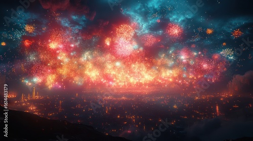 Fireworks explode over a city at night. A vibrant display of colorful bursts fills the sky, above a hazy cityscape