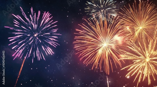 Fireworks in the night sky above a peaceful park, no people, with space for festive messages