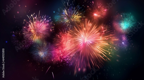 Fireworks on colorful bokeh background. Happy New Year. Generative AI.