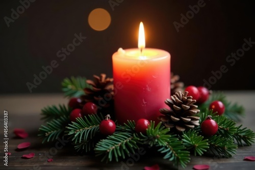 First advent candle lit on wreath, pine cones , winter, hygge, hope